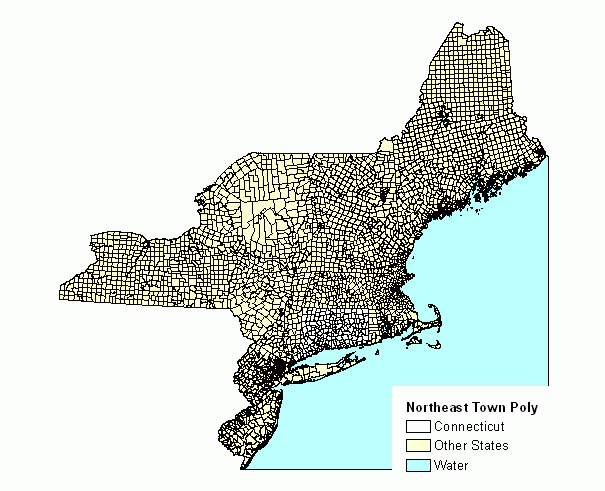 Create NORTHEASTTOWN (Northeastern United States Town Boundary - The automated process for creating (deriving) the Northeastern United States Town Boundary layer from the Northeastern United States Political Boundary Master layer is documented in an Arc Macro Language (AML) script named MAKENORTHEASTCOVER.AML for the political and administrative boundary category of data for the State of Connecticut, Department of Environmental Protection. The MAKENORTHEASTCOVER.AML creates the Northeastern United States Town Boundary layer by extracting and processing the necessary features from the Northeastern United States Political Boundary Master layer. The following describes the steps undertake by the automated process to create the NORTHEASTTOWN ArcInfo Coverage. First, the following polygon attributes were deleted from a copy of the NORTHEASTM ArcInfo Coverage so that all remaining attributes only described state, county, and town-level information: TOWN_COD, VILLAGE, and UNIQUEID. Note, the TOWN_COD field was removed because it identified VILLAGE entities in data from New York and possibly New Jersey. Second, polygon and line features were merged (dissolved and unsplit) based on similar attribute values using the ArcInfo Dissolve command with the NET option (argument). As a result, previously adjacent (village) polygons were combined to form larger town polygon features. Third, the following polygon feature attributes were added and populated with values for classifying, highlighting and differentiating polygon features in one state differently from all other states: CT_LEGEND, MA_LEGEND, ME_LEGEND, NH_LEGEND, NJ_LEGEND NY_LEGEND, RI_LEGEND, and VT_LEGEND. These attributes were added for cartographic purposes. Fourth, the STATE_NAME field, which stores state names, was added and populated to complement the STATE_COD attribute. Fifth, added the CT_LABEL_Y and CT_LABEL_N polygon attributes in order to easily label all Connecticut towns or all but Connecticut towns with their corresponding town name without using the LABEL_FLAG field to query for the appropriate features to label with the MAP_LABEL attribute values, which is a slower technique. Sixth, added and populated the line attribute named LEGEND, which classifies county boundaries as town boundaries and provides a simpler classification of boundary features than the BOUNDARY attribute. The name of the resulting ArcInfo Coverage created by this automated process is NORTHEASTTOWN.