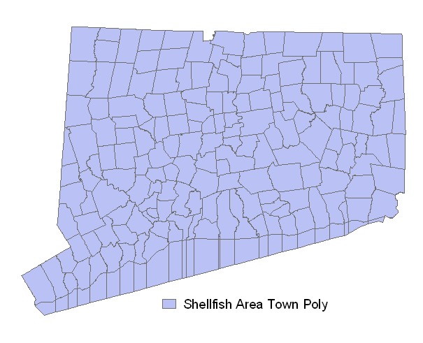 The Connecticut Department of Environmental Protection cooperated with the Department of Agriculture, Bureau of Aquaculture to publish the Connecticut Shellfish Classification data. More recent information may be available from the Department of Agriculture since the time this information was originally published in 2006. For information or questions on shellfish area classifications contact the Connecticut Department of Agriculture, Bureau of Aquaculture (DA/BA). Mailing address: P.O. Box 97, Milford, CT, 06460, USA. Voice: 203-874-0696. Fax: 203-783-9976. E-mail: dept.agriculture@snet.net. Final authority for the classification of any shellfish area rests with the DA/BA. This 1:24,000 scale layer depicts town boundary lines as shown on DA/BA oyster/shellfish ground charts. These boundary lines extend to the Connecticut/New York mid-Long Island Sound boundary line. This datalayer is composed of polygon features. See also the corresponding line feature class (Shellfish Area Town Line). This layer is intended to be used for cartographic purposes in conjunction with the 1:24,000 scale Shellfish Area Classifications data that represent the classifications of shellfish growing waters for the State of Connecticut shoreline towns. Shellfish Bed Jurisdiction is a related datalayer that depicts the jurisdiction line on the charts, i.e., the boundary between state and town jurisdictional control over shellfish grounds. It is referenced here to clarify that in some cases the town boundary lines of the Shellfish Area Town Poly layer and the Shellfish Bed Jurisdiction layer are different and are so noted. General Information Applicable to Shellfish Classifications Datalayers: The shellfishing areas are delineated and classified by the DA/BA, which is the state shellfish control authority in Connecticut. The Connecticut Department of Environmental Protection (DEP) applied information from the DA/BA to the hydrography data to create digital data of shellfish area classifications. DA/BA reassesses pollution sources and shellfish growing areas annually. The digital data is current to that effective date or last amended date recorded on the assessment date list (see supplemental information). This data is subject to change and the DA/BA may have more recent information for some areas. The shellfish datalayers that can be used together as a group include Shellfish Area Classification Line, Shellfish Area Classification Poly, Shellfish Area Marina, Shellfish Area Marker, Shellfish Area Town Poly, Shellfish Area Town Line, Shellfish Bed Jurisdiction, and Connecticut Managed Shellfish Beds.