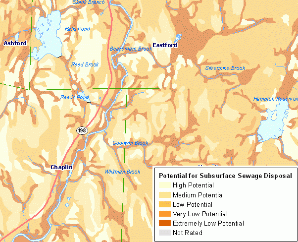 Subsurface Sewage Disposal Systems consist of a house sewer, a septic tank followed by a leaching system, any necessary pumps and siphons, and groundwater control system on which the operation of the leaching system is dependent. This soil potential rating focuses mainly on the septic tank leaching field and groundwater control system.